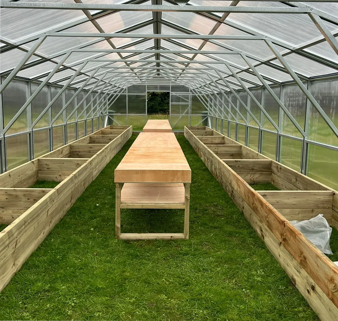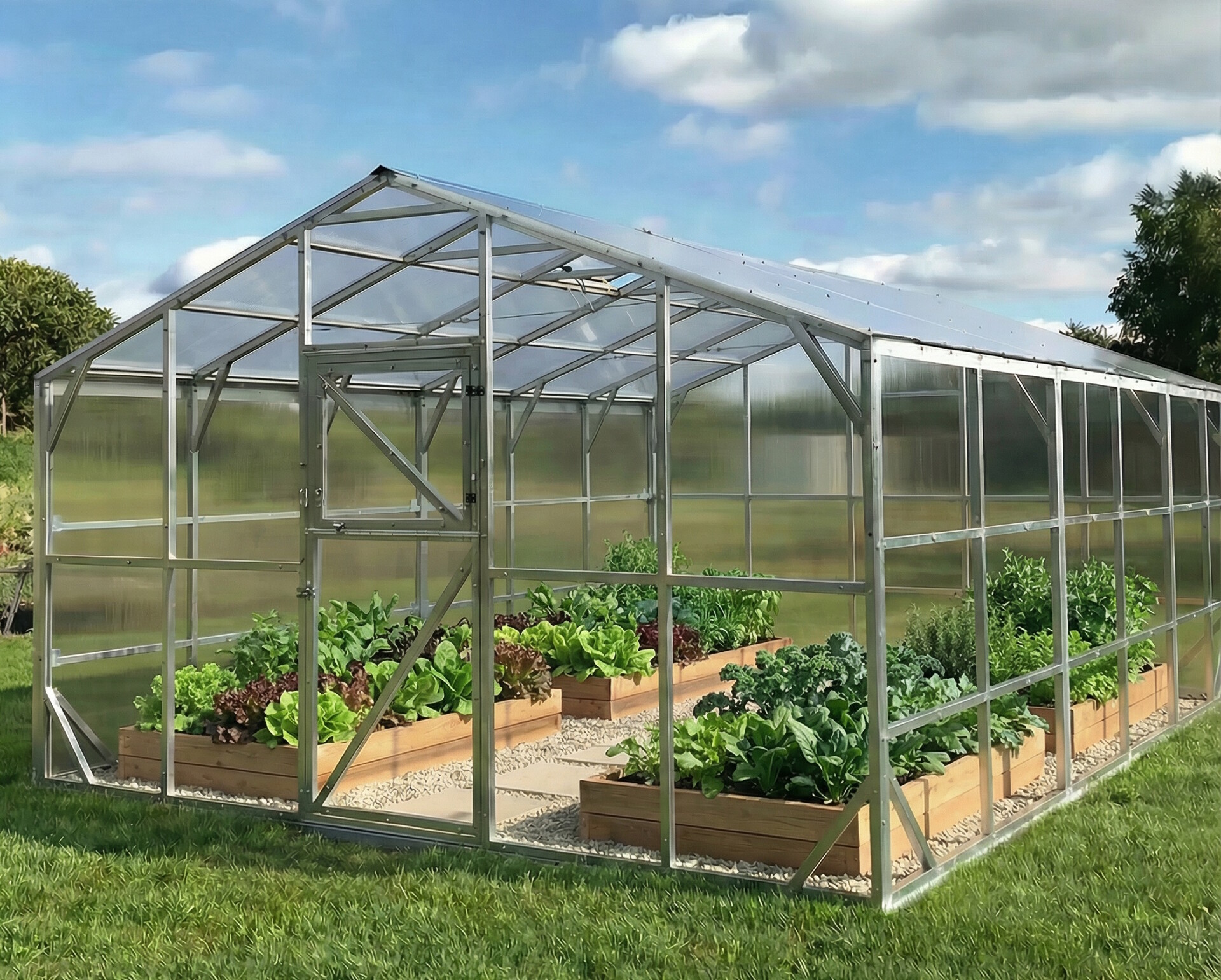 Szklarnia jest dostarczana z poliwęglanem o grubości 6mm, które są wystarczająco mocne i odporne na ciepło dla szklarni „sezonowej”.