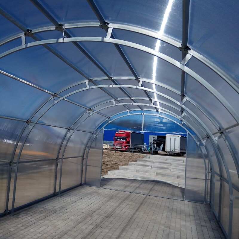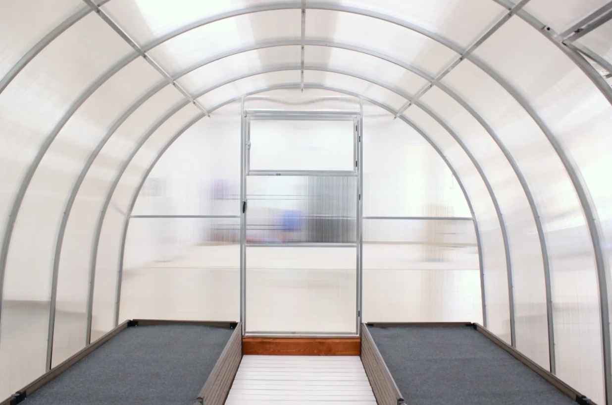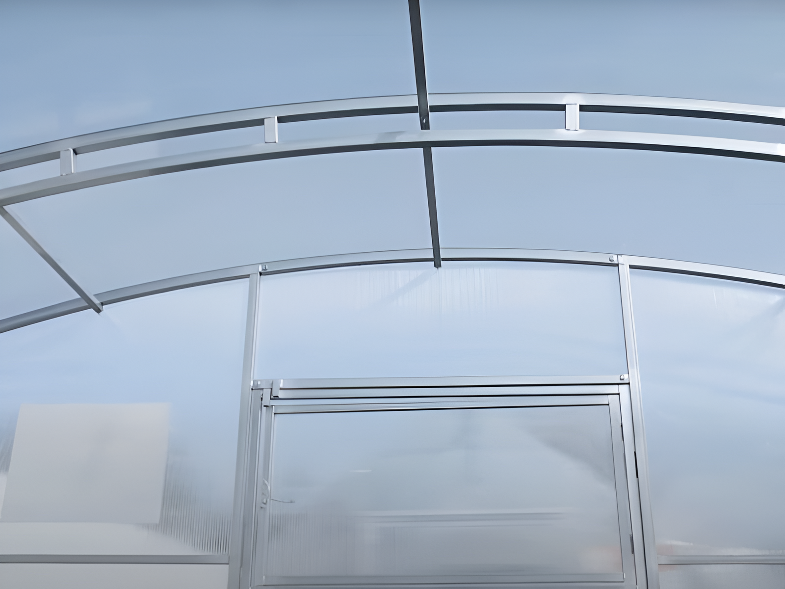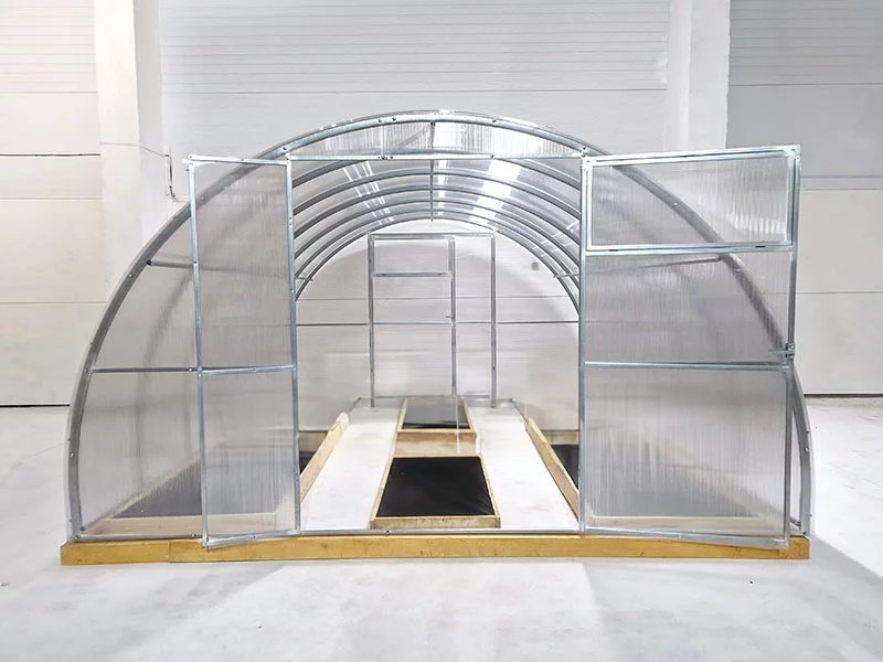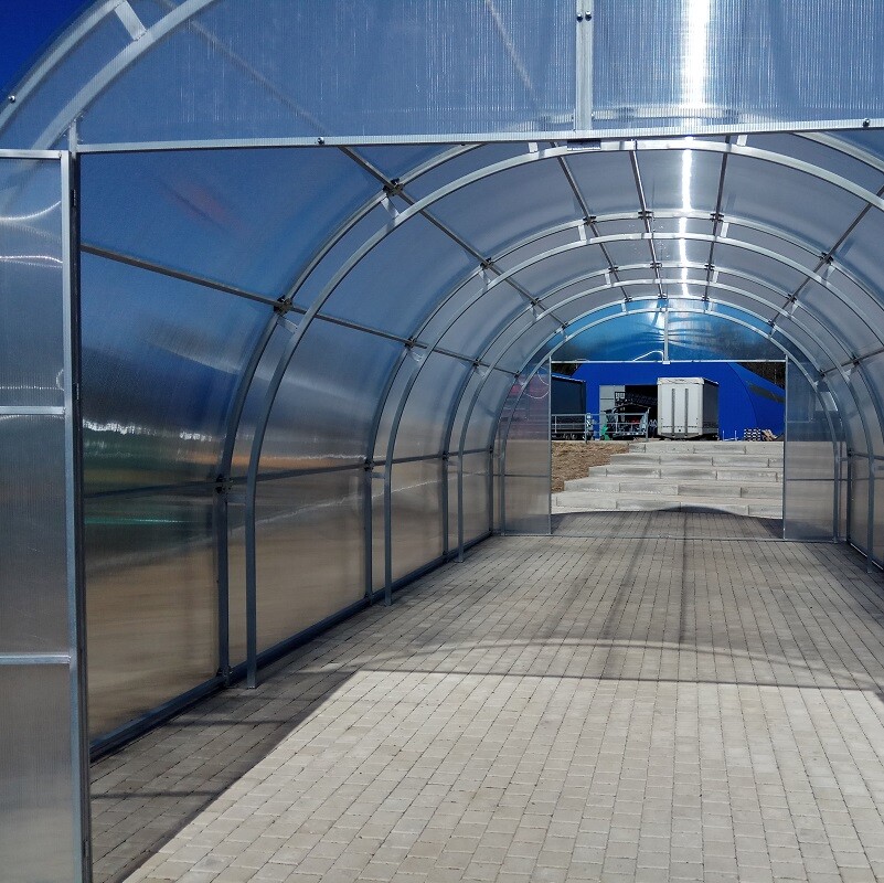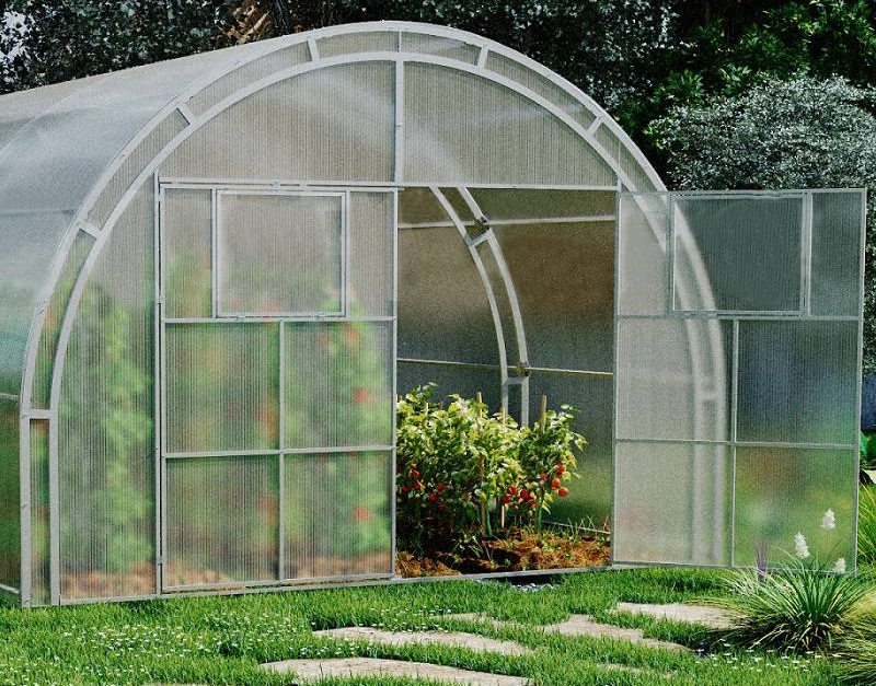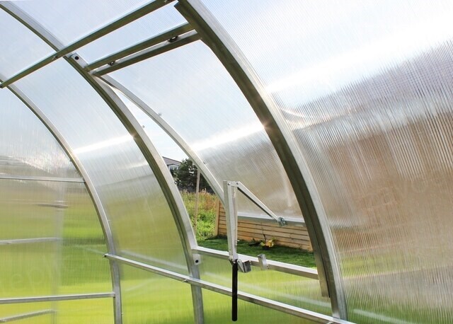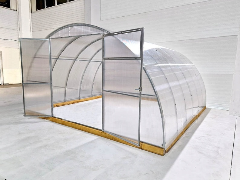 Poliwęglan o grubości 4 lub 6 mm z ochroną przed śniegiem i promieniowaniem UV, dwoje drzwi i dwoje okien do wentylacji.