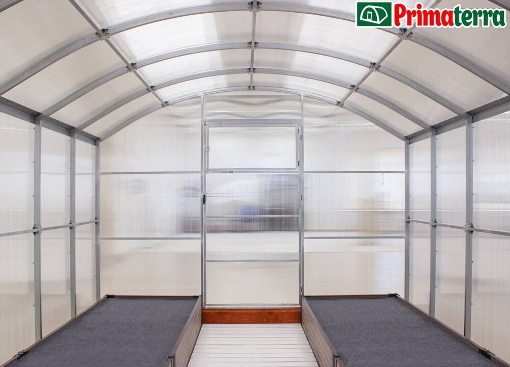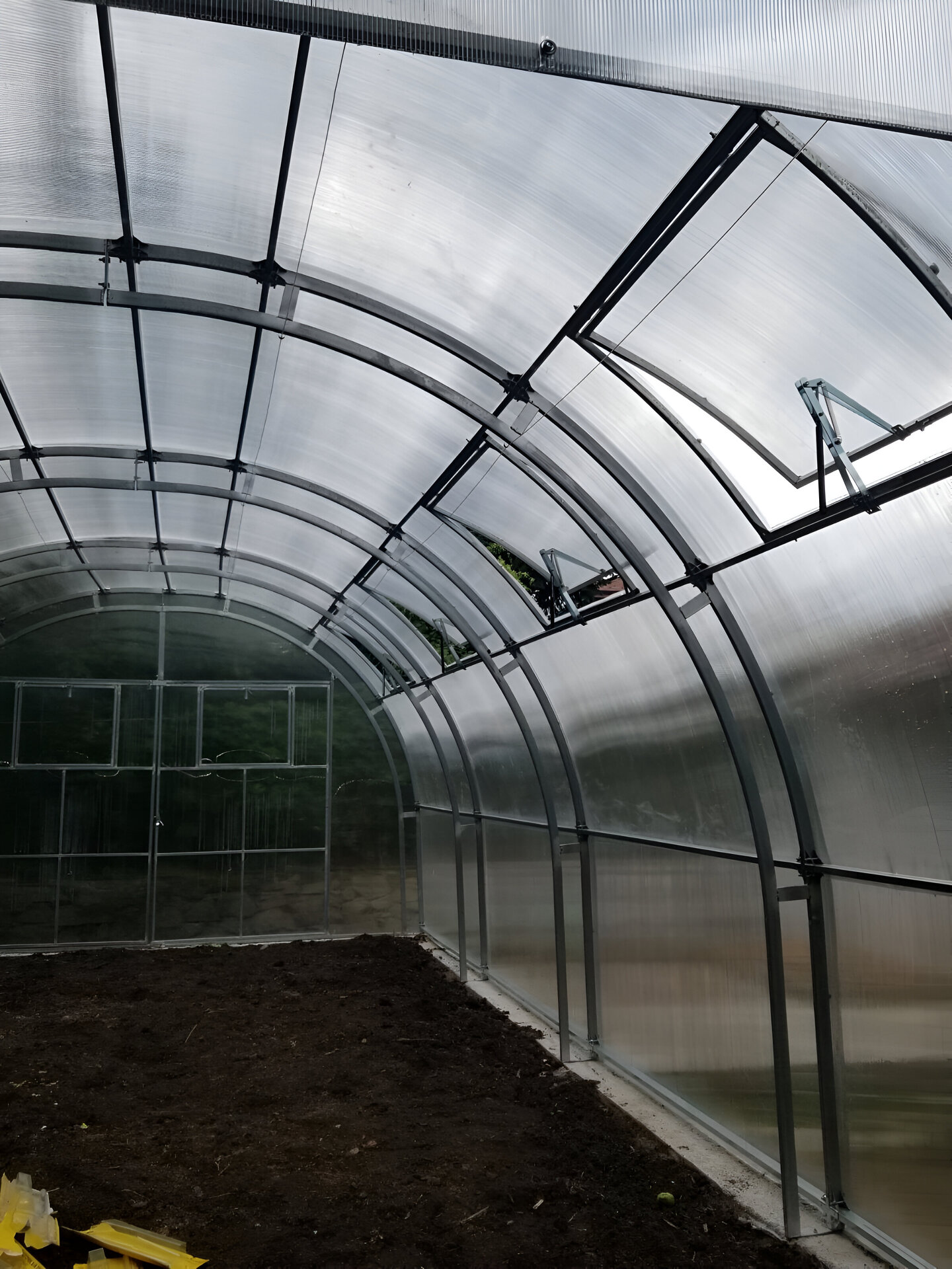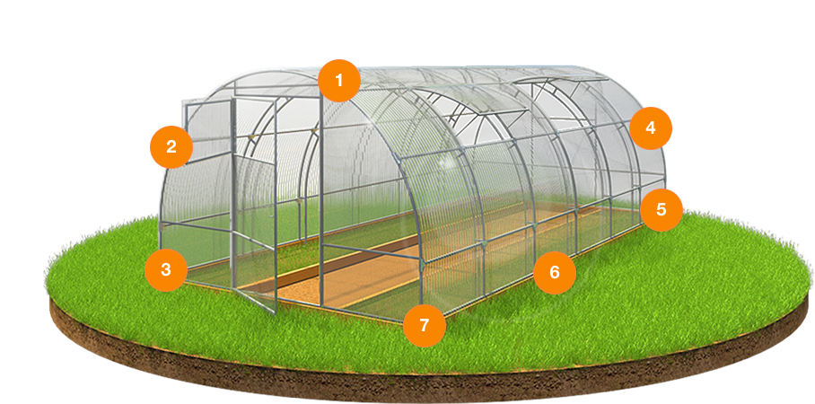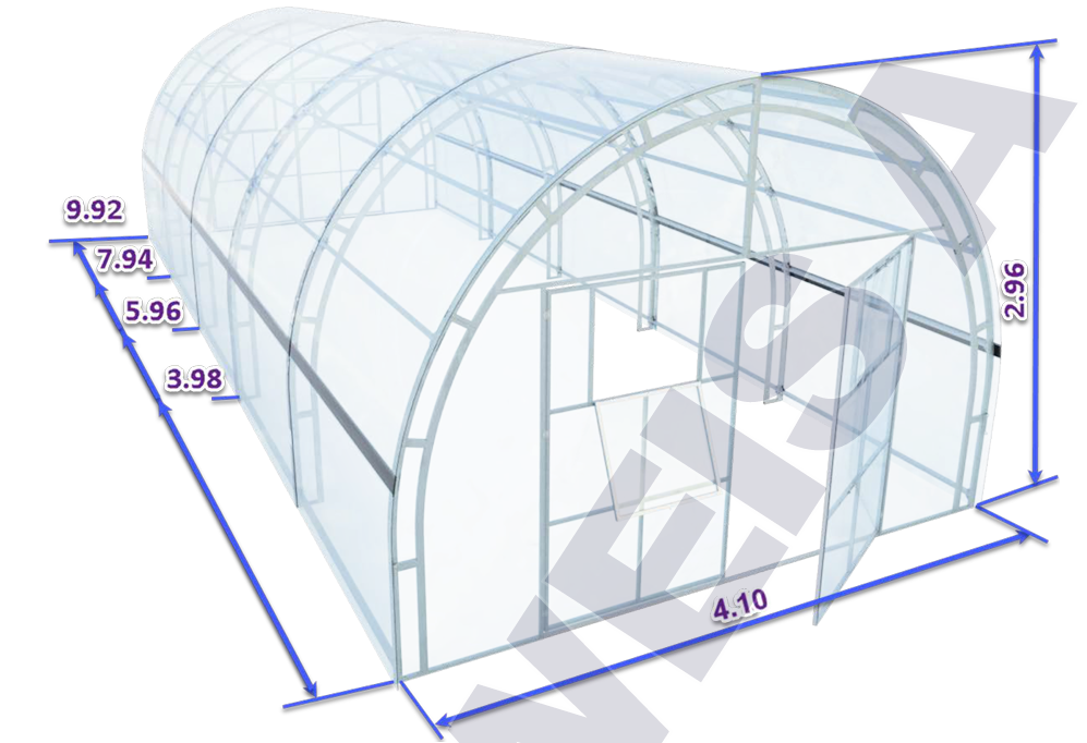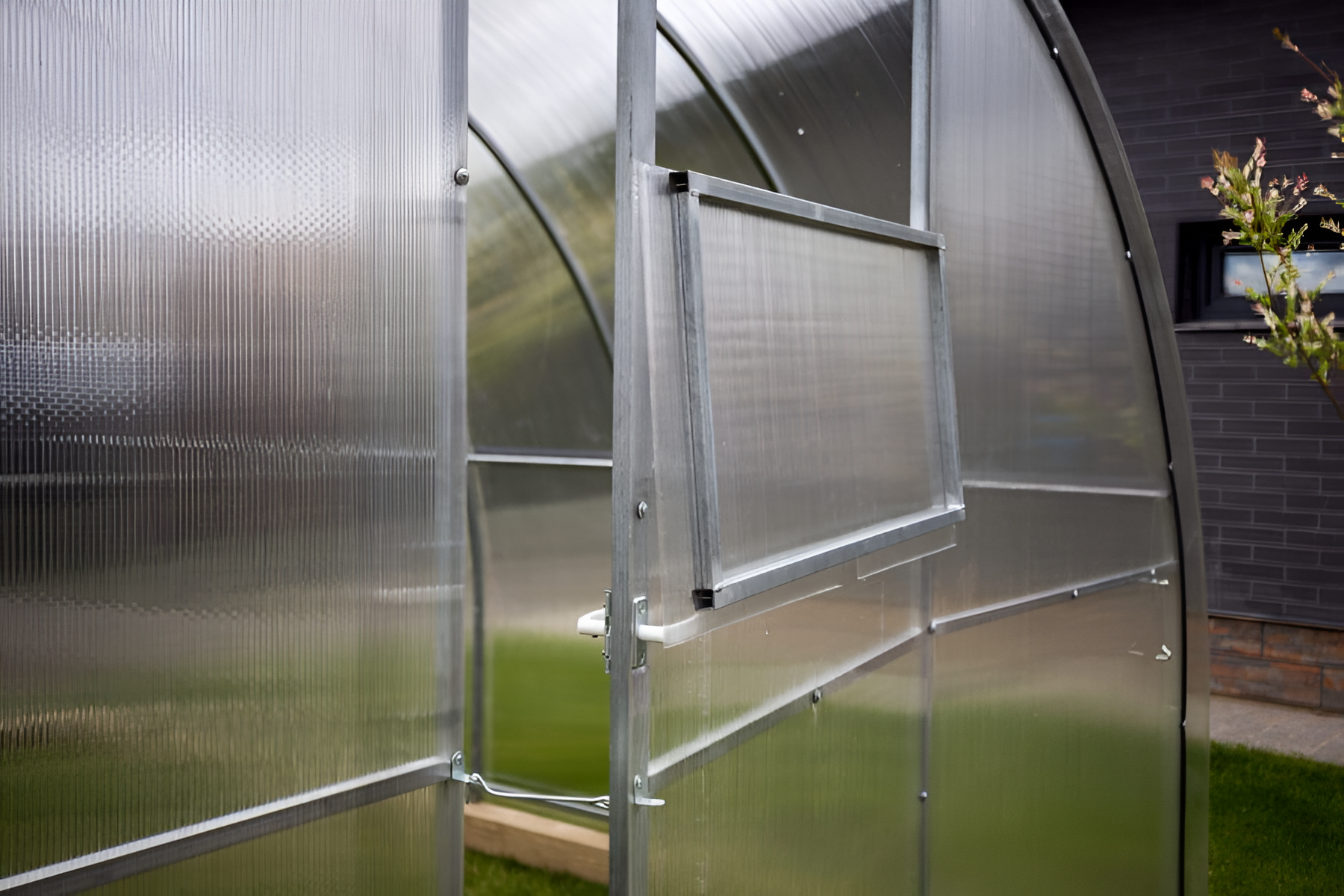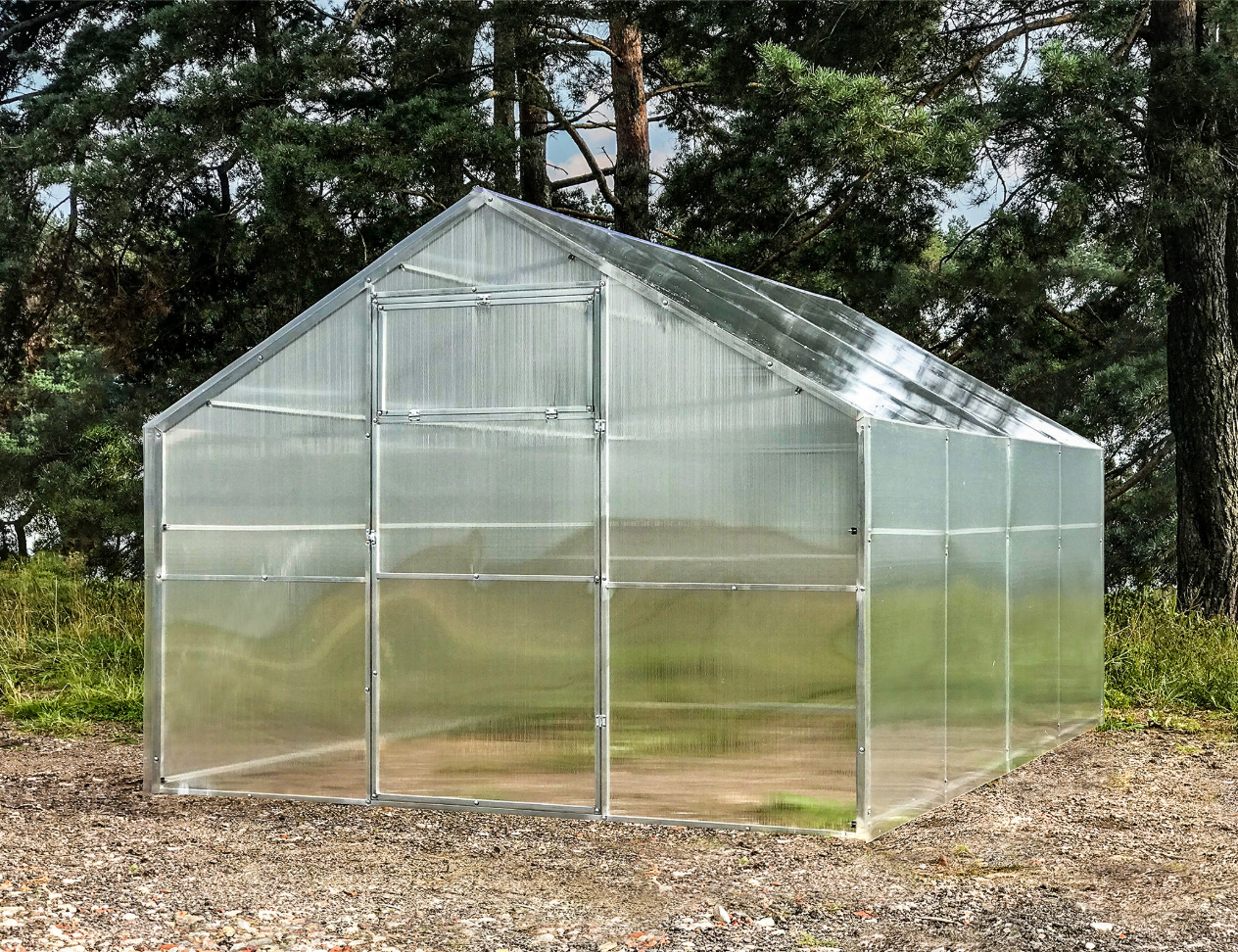 Poliwęglan o grubości 4 lub 6 mm z ochroną przed śniegiem i promieniowaniem UV, dwoje drzwi i dwoje okien do wentylacji.
