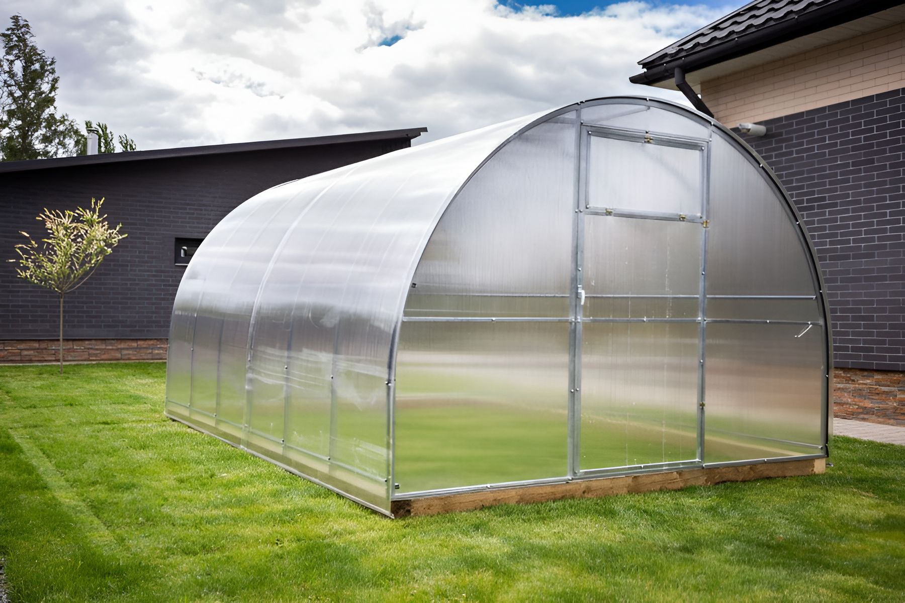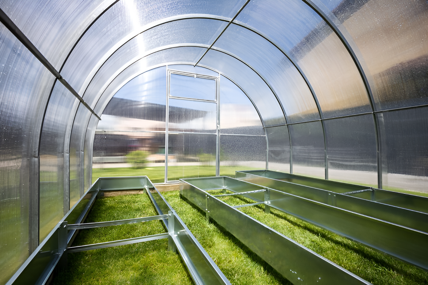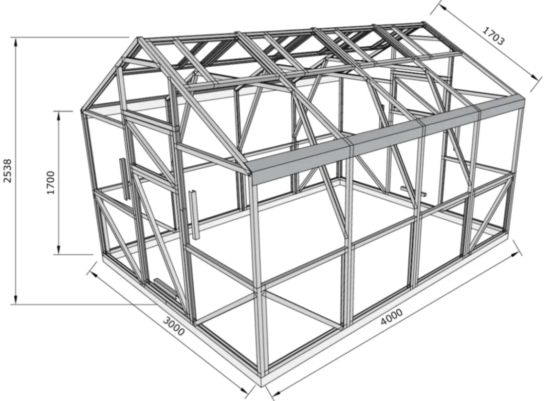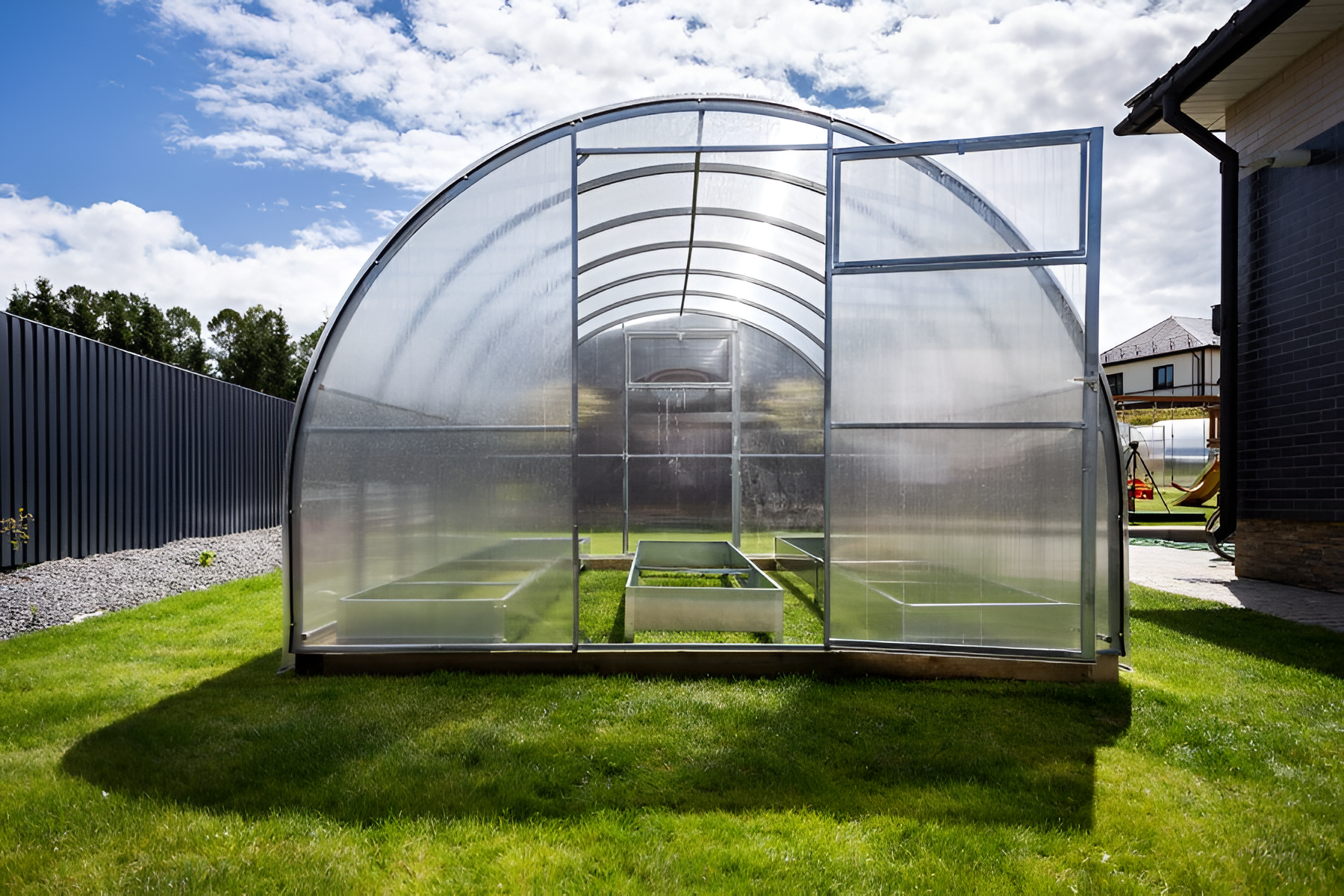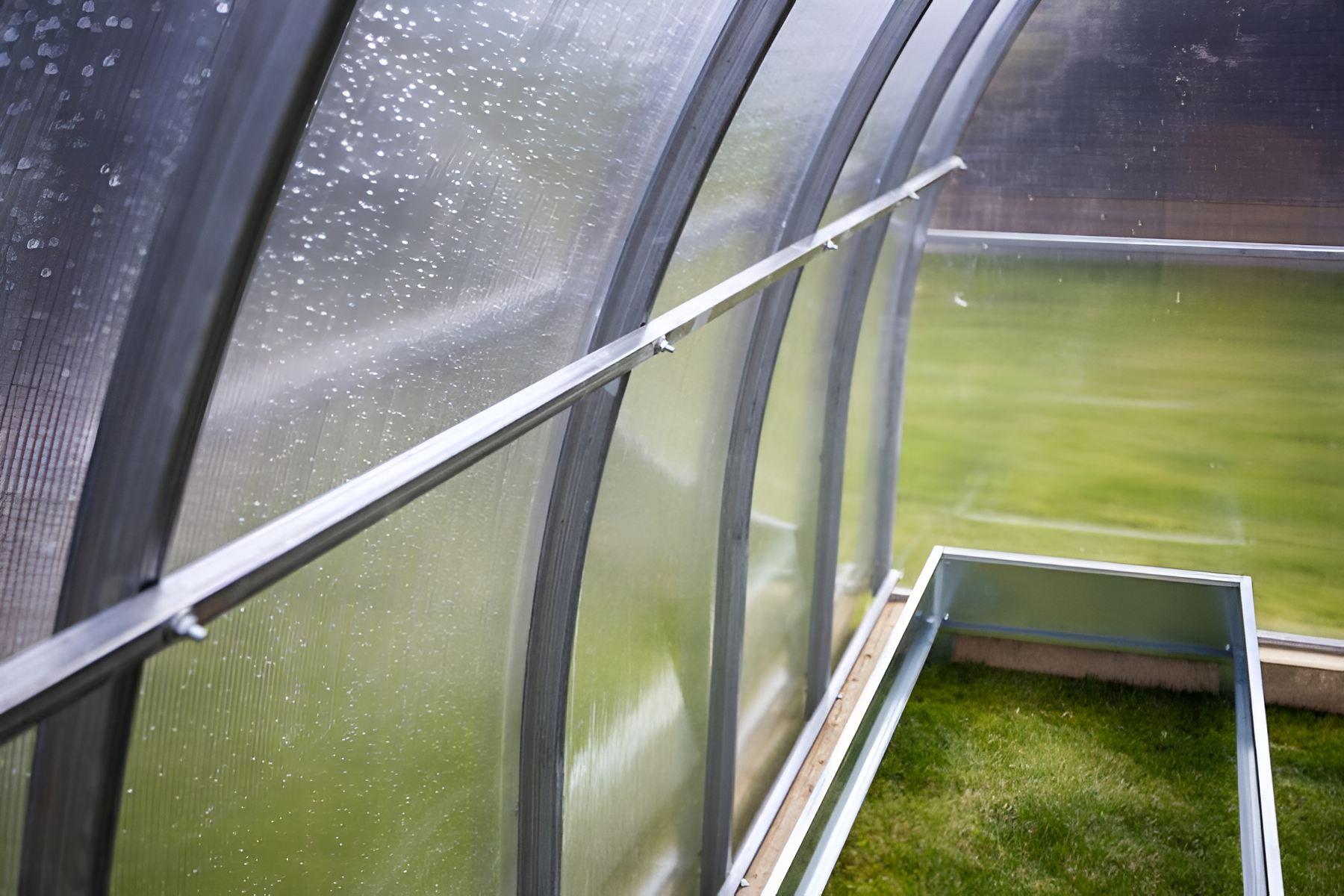 Poliwęglan o grubości 4 lub 6 mm z ochroną przed śniegiem i promieniowaniem UV, dwoje drzwi i dwoje okien do wentylacji.
